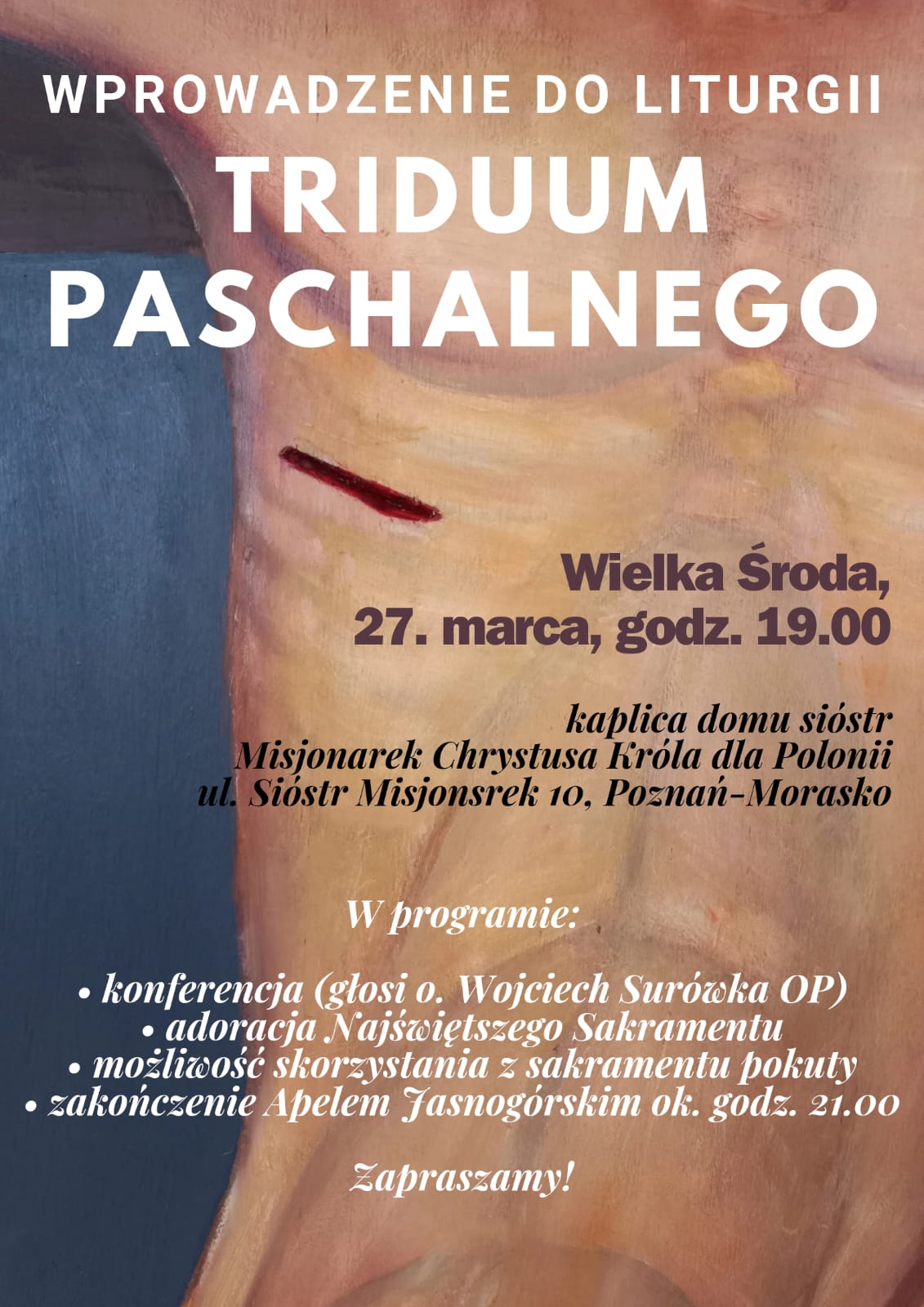 W Wielką Środę 27 marca 2024 r. o godz. 19.00 odbędzie się w kaplicy naszego Zgromadzenia przy ul. Sióstr Misjonarek 10 w Poznaniu wprowadzenie do Liturgii Triduum Paschalnego.